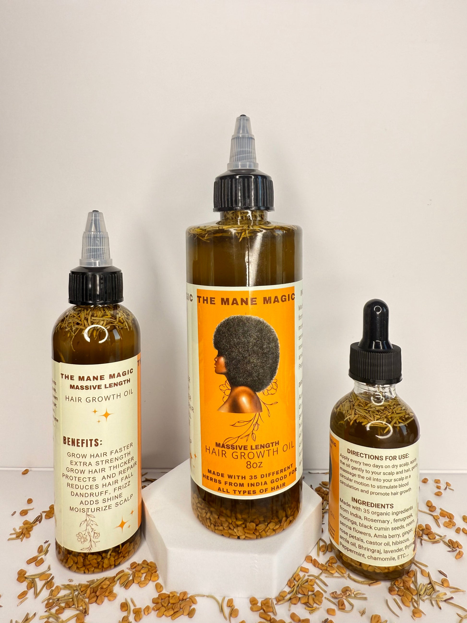 The Mane Magic Hair Growth Oil 2oz, 4oz, 8oz bundles Haircare with 35 organic ingredients to stimulate and promote healthy and hair growth.